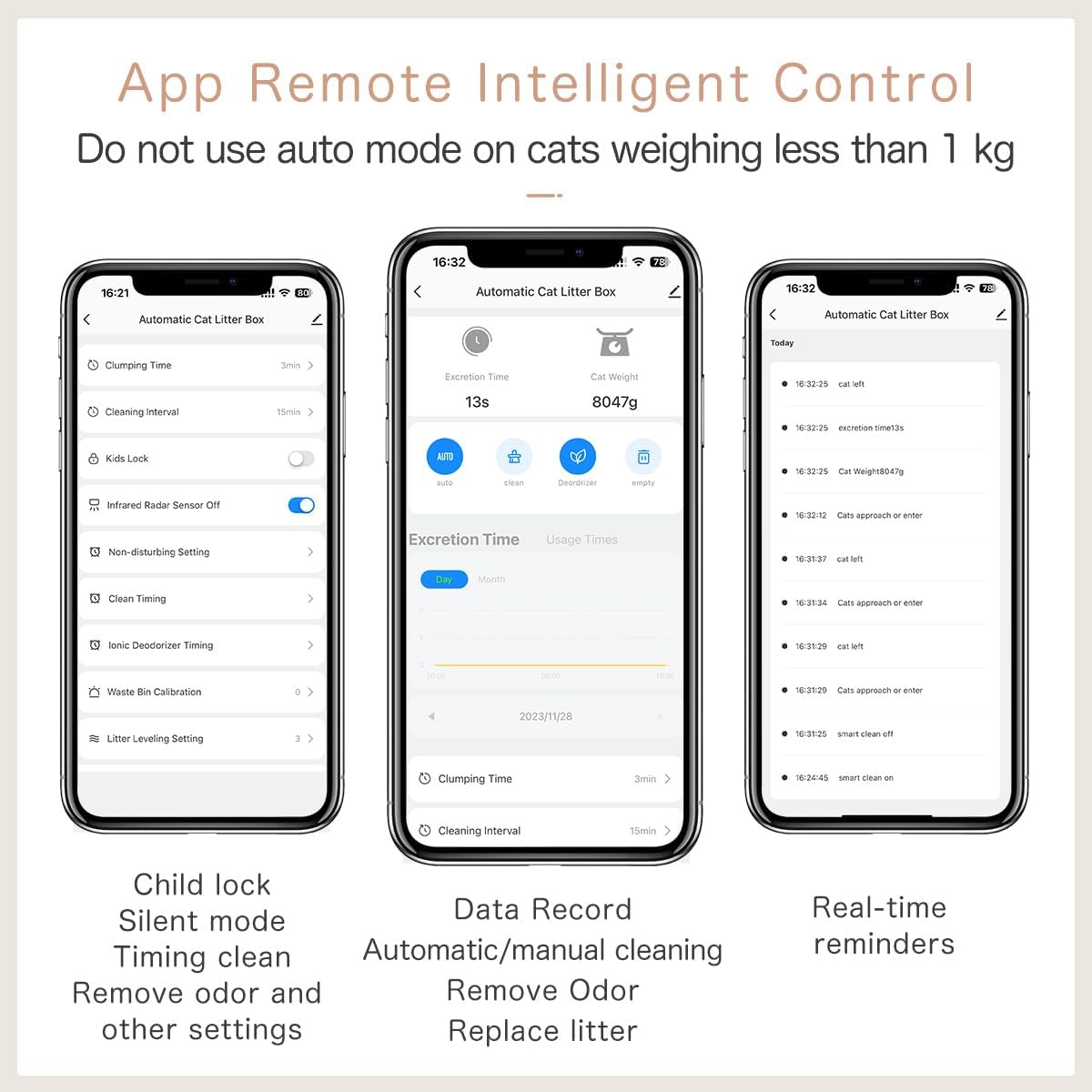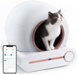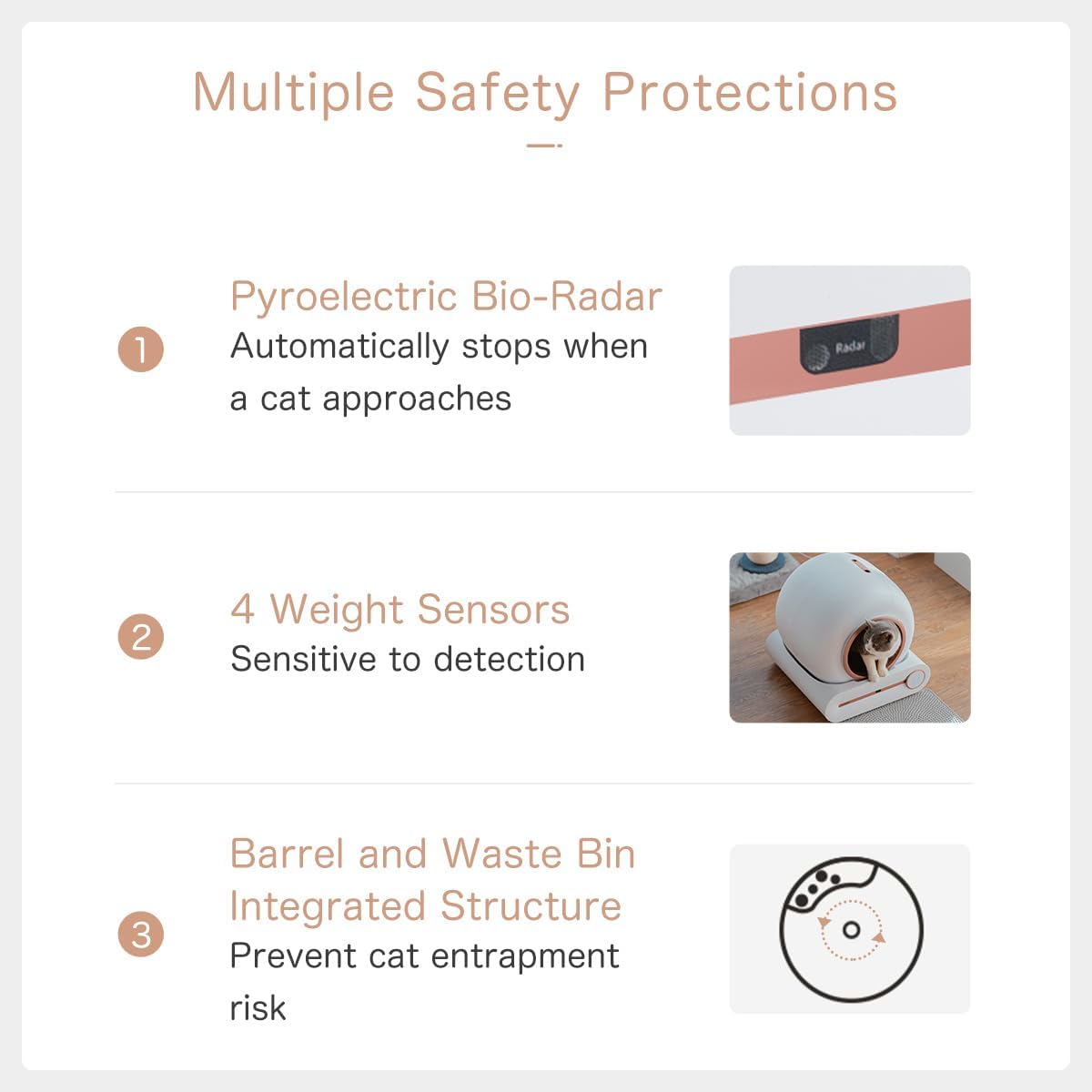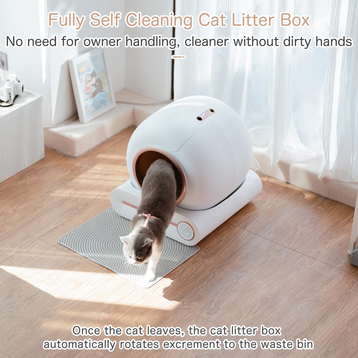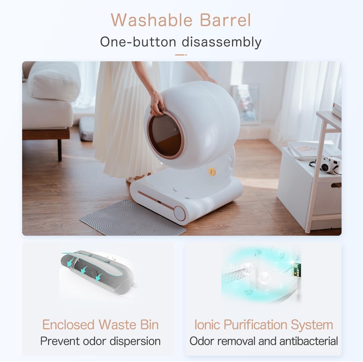 [Self-Cleaning] The automatic cat litter tray can automatically detect when pets enter and exit the toilet and clean it automatically. After powering on, please check if the "auto" icon on the panel is illuminated, or confirm in the app that the "auto" mode is selected to activate the automatic cleaning function. The cat litter box is equipped with a 9-liter waste bin, which can meet the waste storage needs of dual-cat households for one week! No scooping! Cleaning the robot cat litter box is effortless. It has only two parts: the barrel and the base. Assembly and disassembly are very simple. [Smart App Control] The self-cleaning litter box for multiple cats can be connected to the network (2.4GHz Wi-Fi only, not support 5GHz WiFi) for remote control through an app. You can monitor the usage frequency of the cat litter box self cleaning, check its self-cleaning status, and manage the litter from anywhere, at any time. Additionally, you can set different modes and choose functions such as Timing clean, odor removal, or litter replacement. [65L Large Capacity] Our round shape design can offer much more space for the cats than other normal box. The huge inner space (65L inner side) provides a comfortable space for the cats and the large waste bin (9L) is big enough to store more cat litter. The large cat litter trays has enough space to accommodate cats ranging in weight from 1kg to 8kg. [Built-In Sensors] Equipped with four sets of weight sensors, the cat toilet can work precisely and avoid hurting the cats. By default, automatic cleaning starts 3 minutes after the cat leaves, and you can adjust the clumping time in the app, ranging from 0 to 60 minutes. If automatic cleaning doesn't start after a long time, please check if the clumping time is set too long. The cleaning process pauses if a cat interrupts while it's working. If necessary, you can also reset the cleaning settings in the app. The automatic litter tray responds accurately to changing conditions, ensuring your cat's safety. [Odor Removal] As a closed container so odor control is essential for a self cleaning litter tray. Built-in ionic deodorisation is safe and non-toxic, and the deodorising and anti-bacterial treatment is carried out by default after each cleaning to keep the air fresh and create a comfortable environment for your cat.